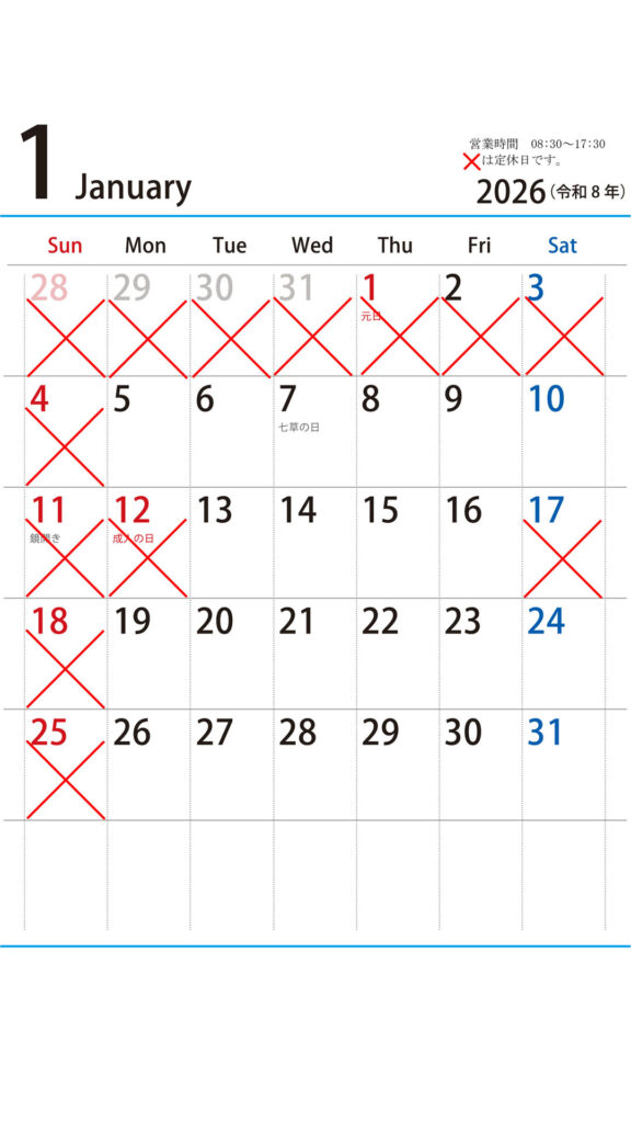 2026年1月のジンワンの営業カレンダー