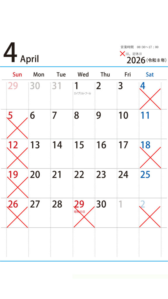 2026年4月のジンワンの営業カレンダー