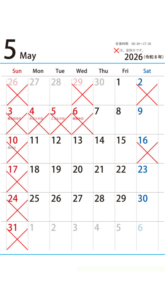 2026年5月のジンワンの営業カレンダー